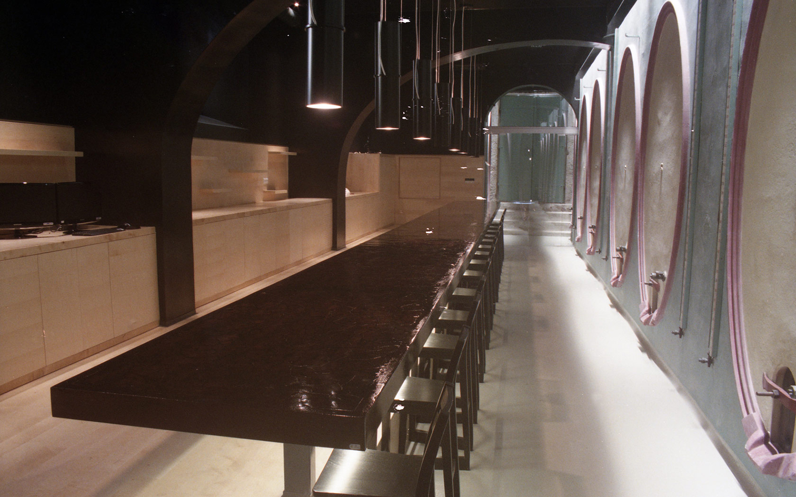 Prenamjena u enoteku realizirana je izvedbom retropulta uz bočni zid prema ulici, sjedećih mjesta u centralnom dijelu prostora i sanitarnog čvora na dnu glavnog prostora, odnosno uz stepenice prema apsidi. Sjedenje je rješeno izvedbom centralnog stola dužine 12m. Taj naglašeni element postavlja posjetitelja kao glavnog aktera u prostoru. Centralna pozicija i dimenzije stola omogućavaju fleksibilno korištenje prostora: svakodnevno kao ugostiteljski objekt, te povremeno kao izložbeno-degustacijski prostor. Dimenzije i pozicija stola omogućavaju i kontroliranje denivelacije po sredini prostorije na način da se stol s jedne strane koristi kao šank uz visoka sjedeća mjesta dok se sa druge strane koristi kao normalan stol za sjedenje. Takvo rješenje također nudi mogućnost kružne komunikacije oko stola, pogotovo pri korištenju prostora u izložbeno-degustacijske svrhe. Postojeći masivni lukovi, koji su vizualno izuzetno nametljiv element u prostoru, nameću se ne svojom kvalitetom, proporcijama i materijalom izvedbe, već iskljućivo kao vrlo jake pregrade koje onemogućavaju percepciju cjelokupnog volumena prostora. Oni se zajedno sa stropom ne potenciraju, već se visokoreflektivnom crnom bojom percepcija granica tih ploha “destabilizirala”, te se skrenula pažnja sa lukova i stropa na bitnije elemente u prostoru kao što su „bačva“ ili eksponati na novougrađenim drvenim površinama (stol, pultevi, police).
