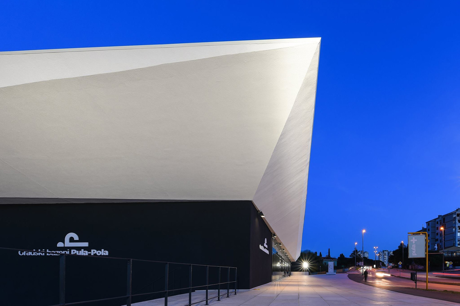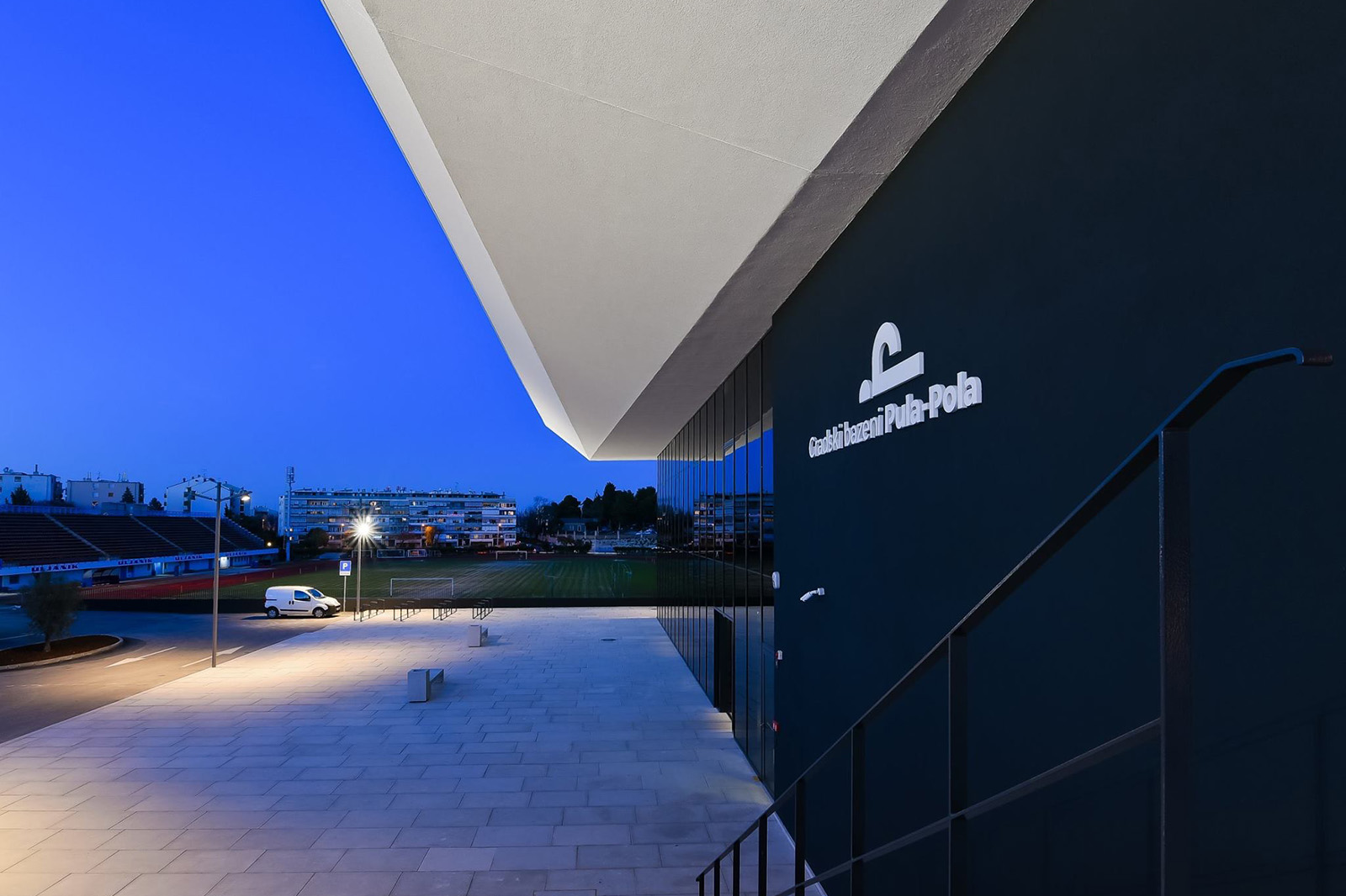 Građevina je tretmanom volumena i pročelja zatvorena na istočnim rubovima, poluotvorena na pristupnim zapadnim i južnim pročeljem, te se kompletno otvara na sjever prema zelenoj plohi stadiona i omogućava ugodno difuzno svjetlo koje je pogodno za sportske aktivnosti. Arhitektonski element nadstrešnice također slijedi tu prostornu logiku te oblikuje i natkriva otvorene javne prostore oko građevine.