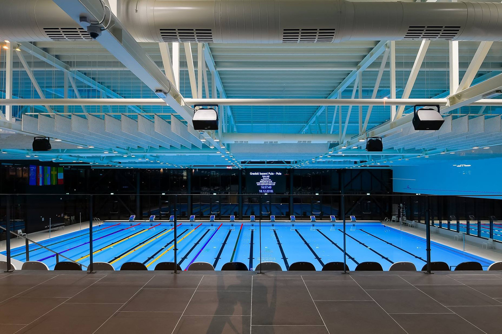 Prvi dio je glavna bazenska dvorana sa bazenom dimenzija 34x25m, te drugi dio koji je odvojen staklenom stijenom zbog različitog temperaturnog režima grijanja i u njemu je smješten multifunkcionalni bazen dimenzija 10x25m sa dijelom za neplivače i dijelom za osobe s posebnim potrebama, te manji bazen za djecu.