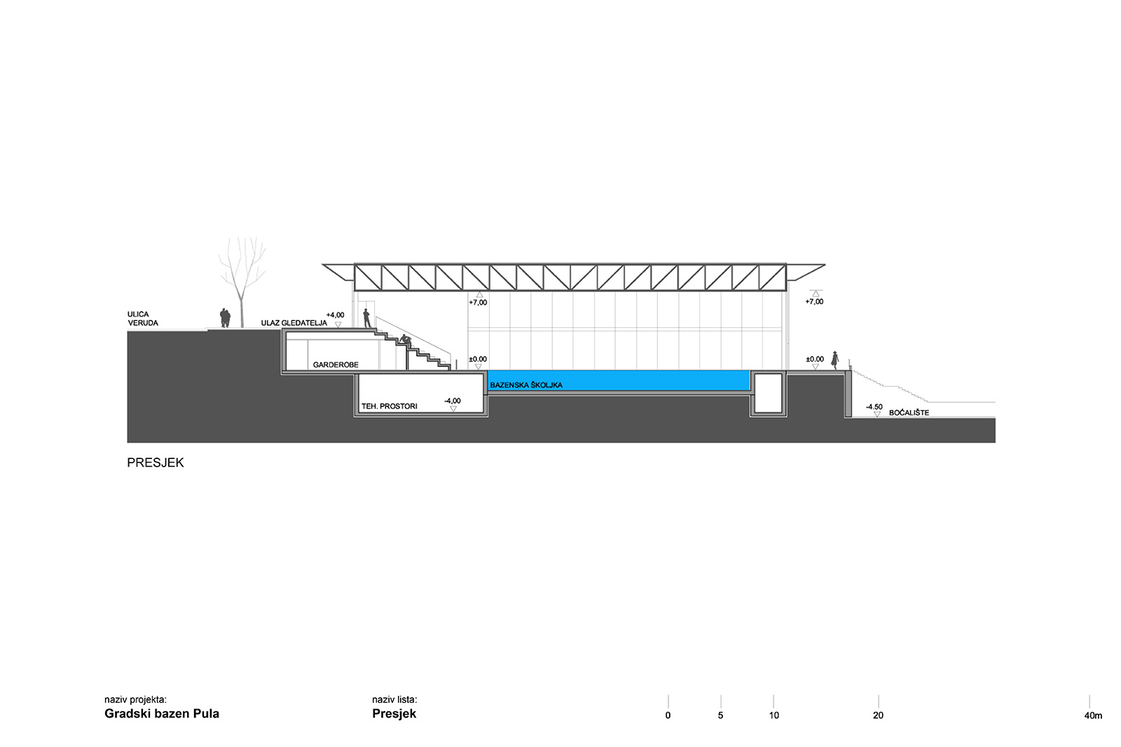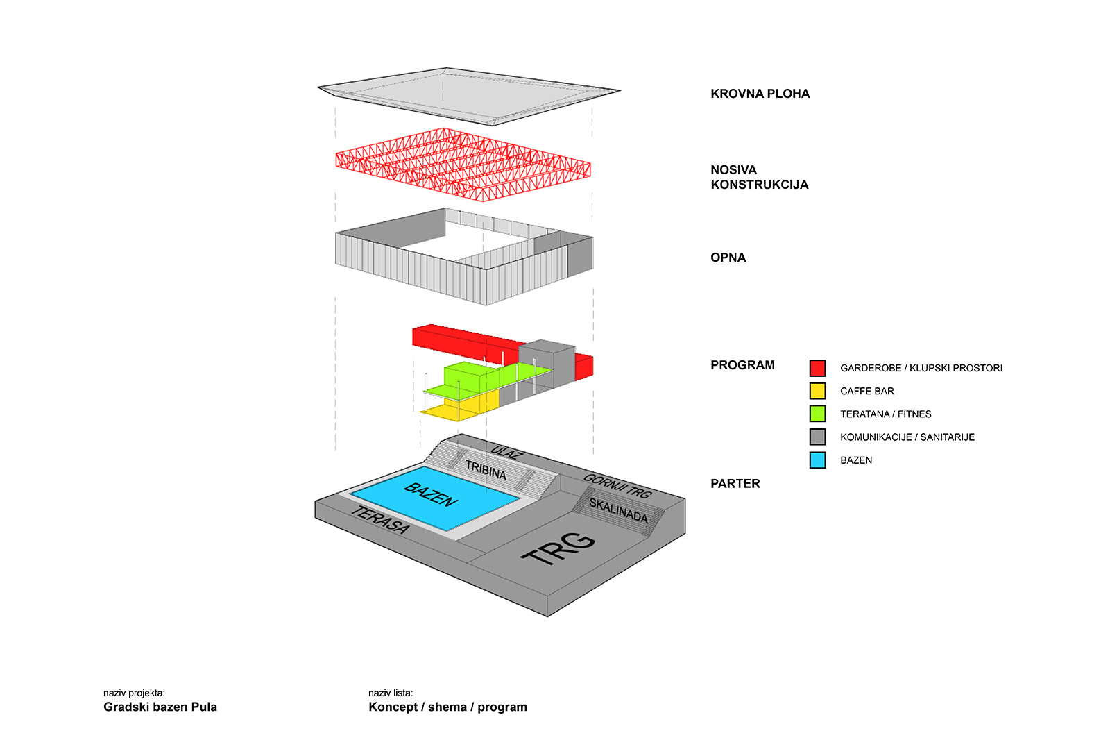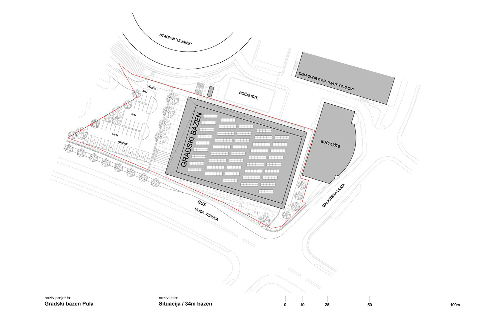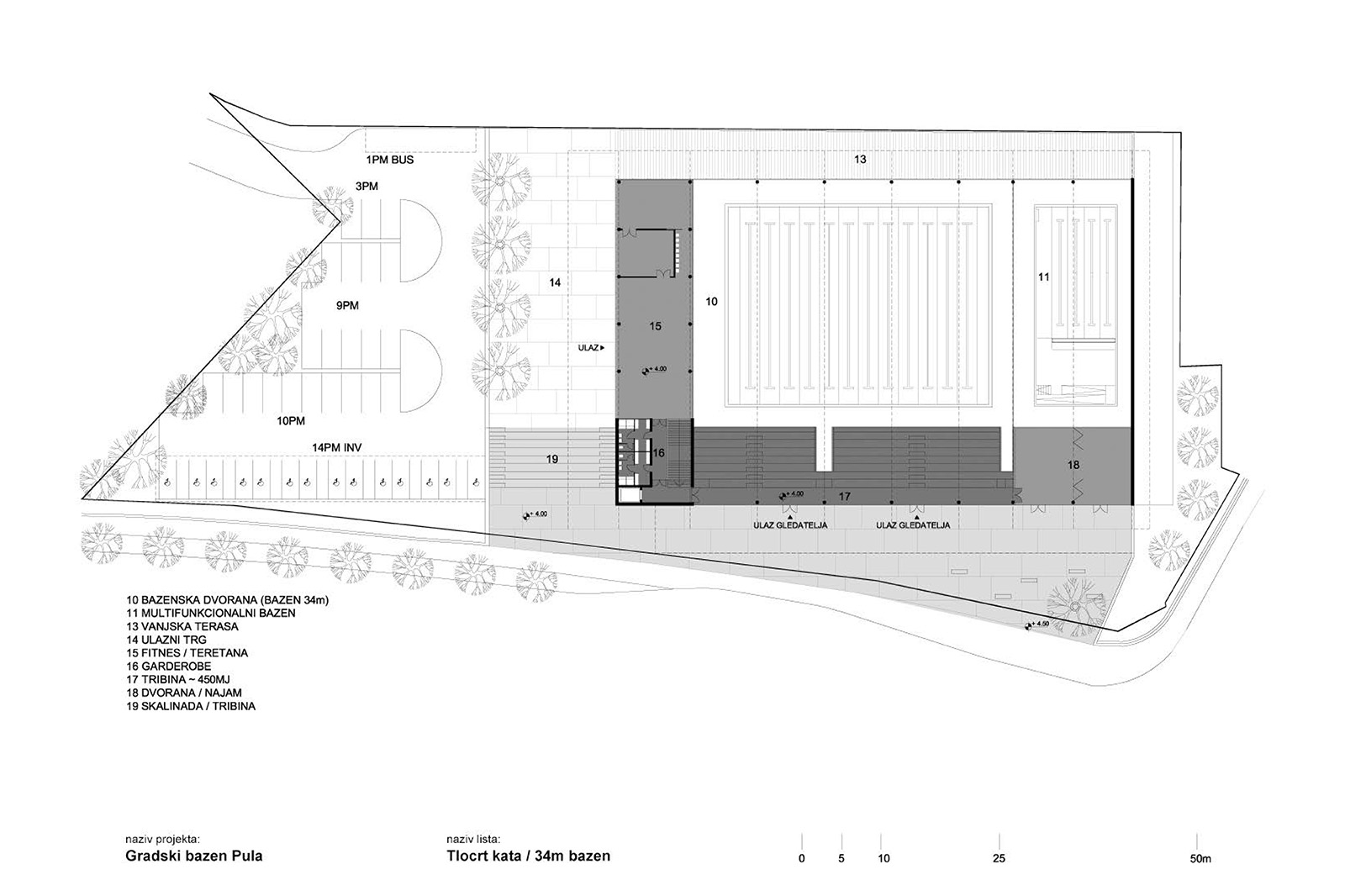 Bazen koristi postojeću prostornu denivelaciju između ulice Veruda i stadiona u funkciji organizacije zadanog programa. Bazenska dvorana sa svim potrebnim pomoćnim prostorijama je smještena na pristupnoj razini glavnog ulaza, dok je u suterenu smještena kompletna tehnička etaža sa svim instalacijama. Tehnička etaža koristi postojeći gospodarski pristup na nivou susjedne sportske dvorane. Ispred same bazenske dvorane smješteno je parkiralište sa pristupnim trgom koje je većom skalinadom povezano sa ulicom Veruda na čijem se nivou formira još jedan pristupni trg.