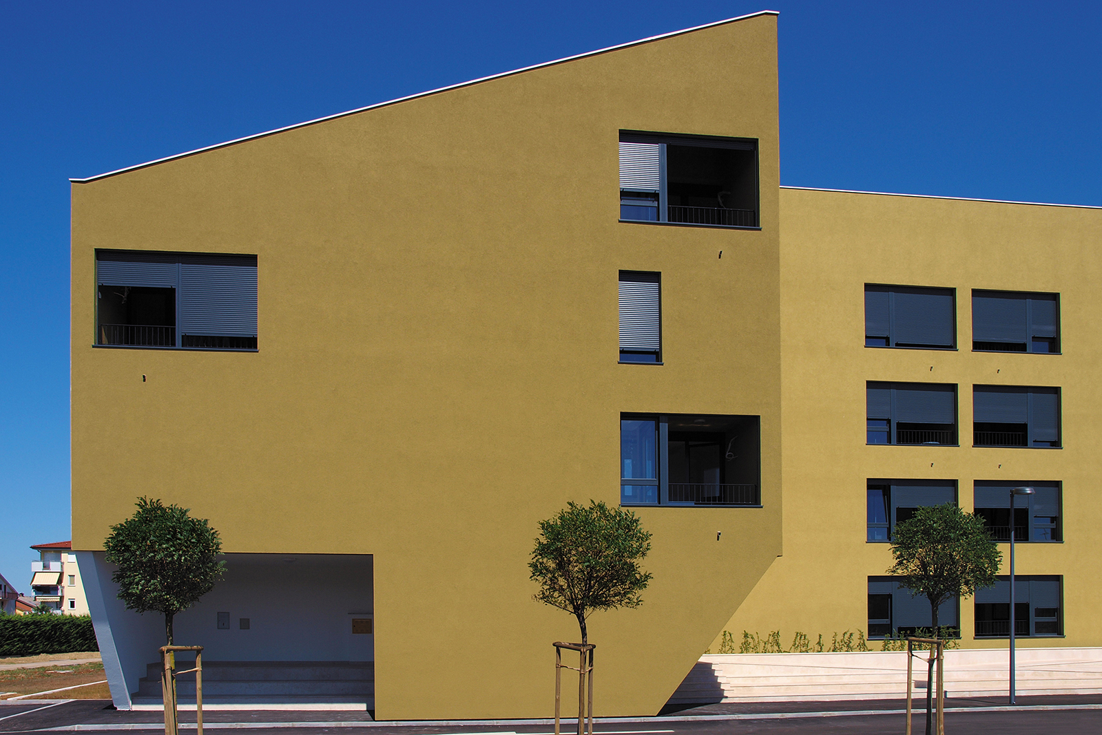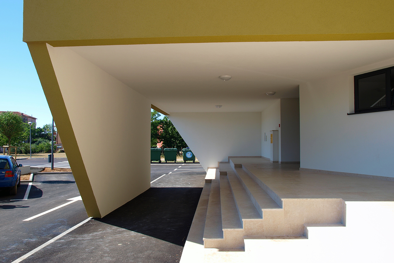 Cijeli je objekt podignut za 1m u odnosu na planiranu završnu kotu okolnog terena kako bi se osigurali kvalitetniji uvjeti življenja u stambenim prostorima prizemlja, te obzirom na slivno područje same lokacije za izgradnju zgrade. S ulične strane denivelacija je riješena ulaznim prostornim sklopom dok su sa stražnje strane formirani pokosi koji završavaju linijskim sjedenjem duž oboda zgrade.