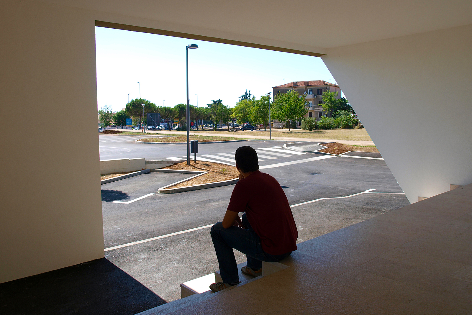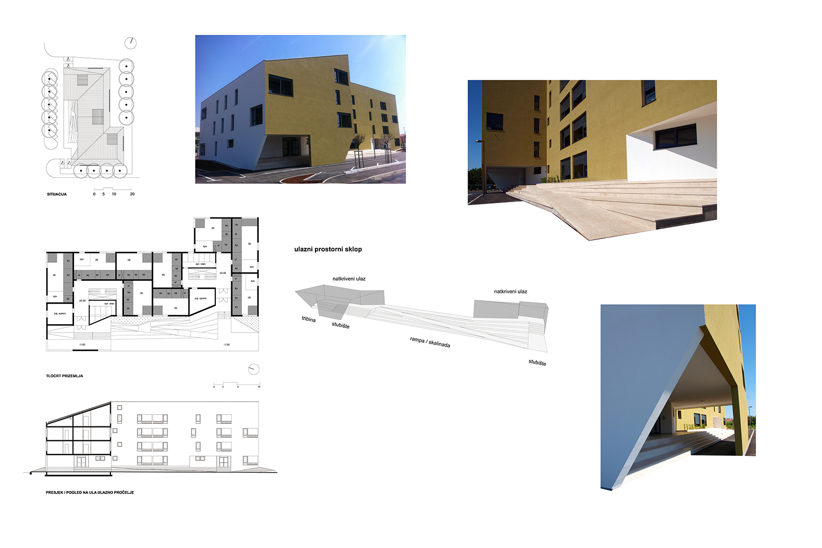 Dio sjevernog bloka je ‘izbušen’ u prizemlju upravo kako bi omogućio formiranje natkrivenog ulaza u zgradu i pješačku komunikaciju prema okolišu i stražnjem dijelu zgrade.