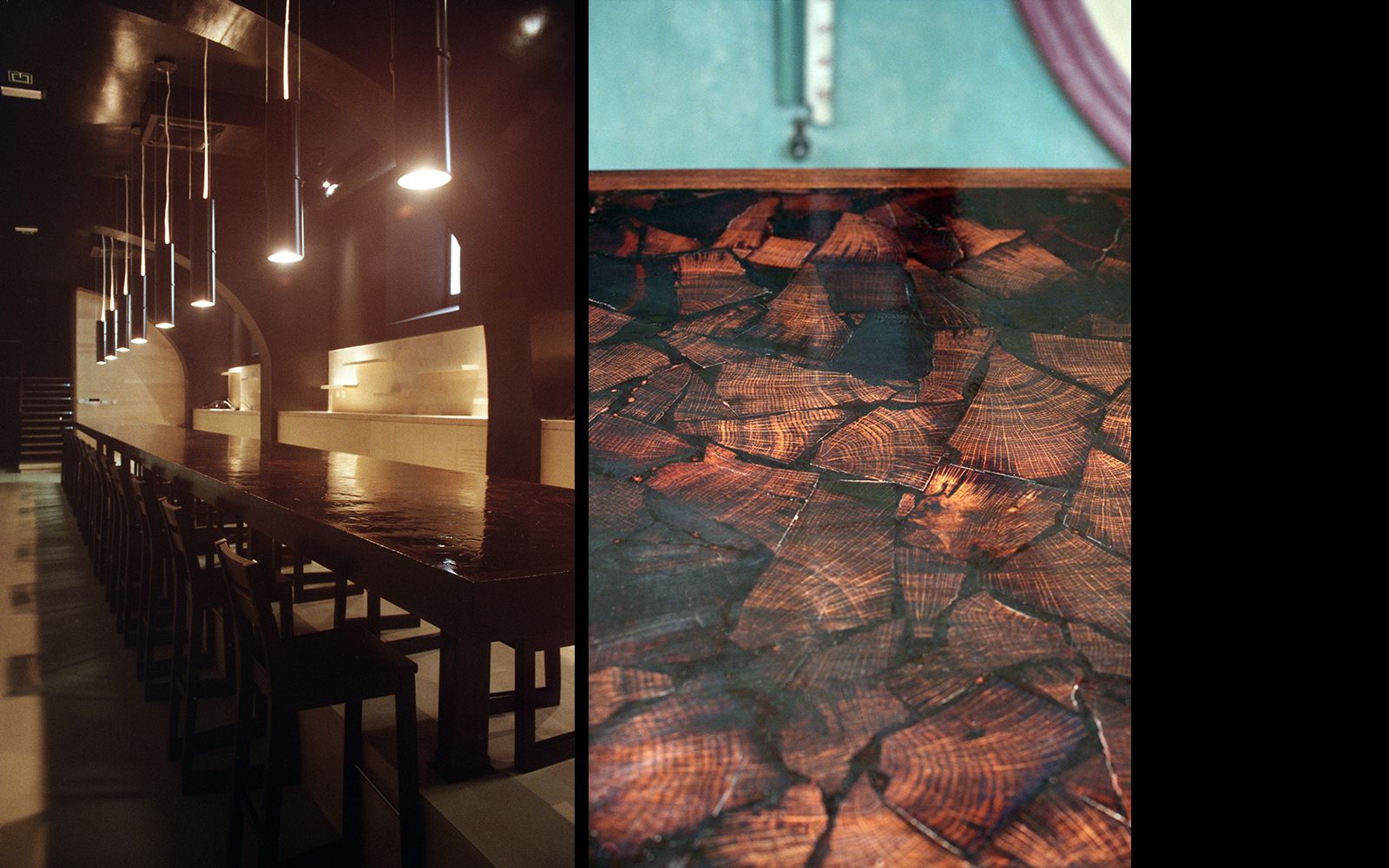 Novo se odvaja od starog u pogledu materijala, teksture, boje, a prije svega je odmak uvijek pun poštovanja. Odvajanje s naglašenom cezurom napravljeno je na način koji nedvojbeno pokazuje što je izvorno, a što dodano. Za sve ovo korišten je prvenstveno samo jedan materijal: drvo, kako za pod podesta denivelacije,tako i za oblogu zidova retroplulta i sanitarnog čvora, te za centralni stol. Ploha stola izvedna je kao mozaik od nepravilnih kalanih komada drva čije su fuge zapunjene epoxidnom smolom i završno lakiran. Time je dobiveno dvostruko mjerilo percepcije stola koje se s ulaza čini kao monolit, dok mu se približavate struktura mozaika se počinje nazirati, a kad sjednete ju potpuno osjetite dodirom.
