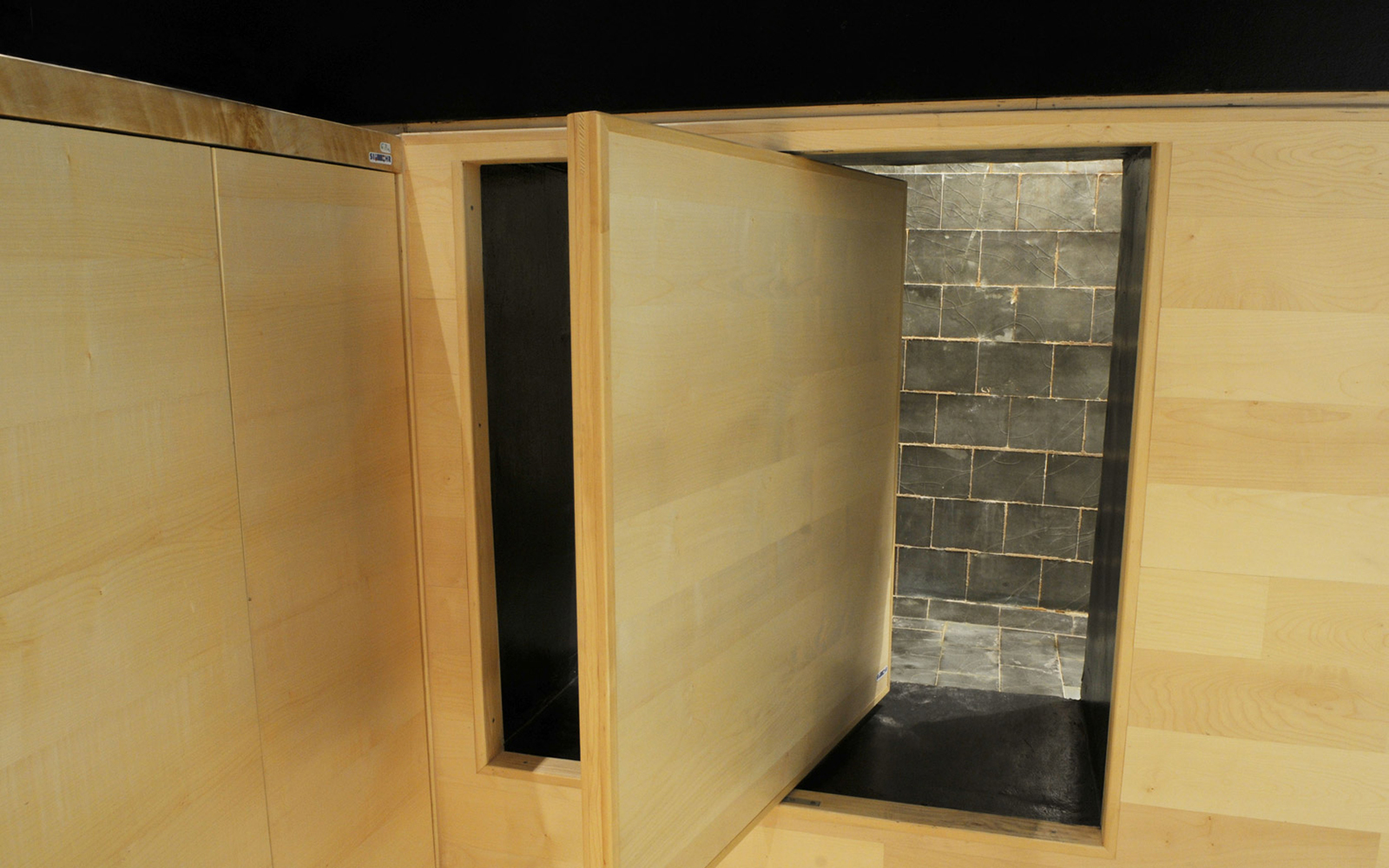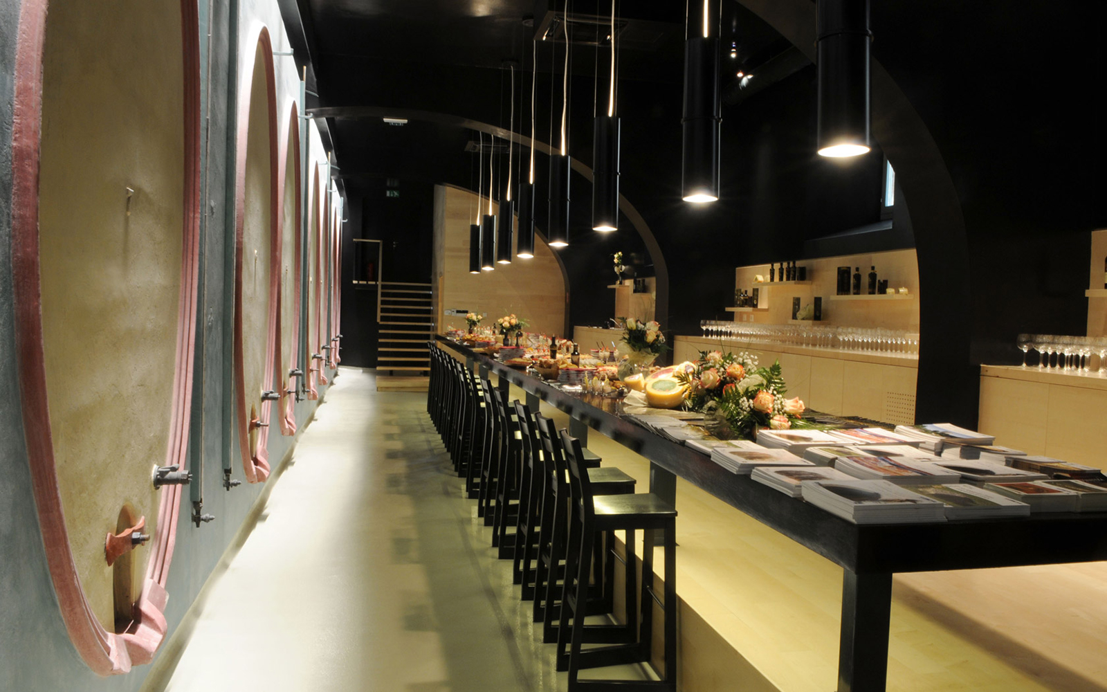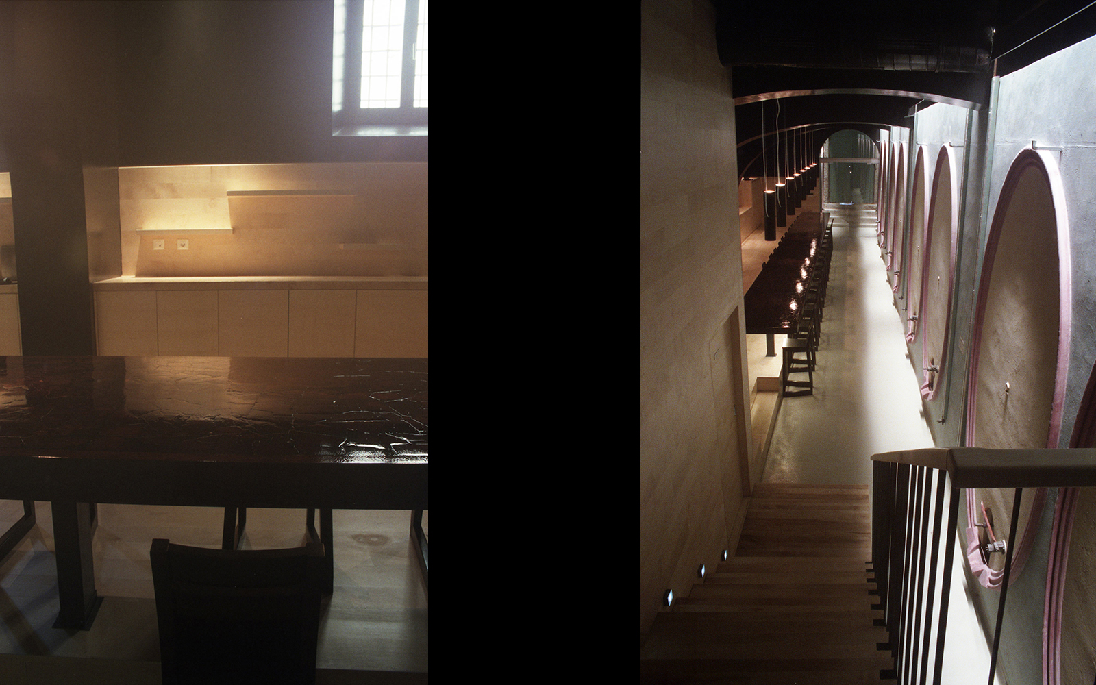 Prenamjena u enoteku realizirana je izvedbom retropulta uz bočni zid prema ulici, sjedećih mjesta u centralnom dijelu prostora i sanitarnog čvora na dnu glavnog prostora, odnosno uz stepenice prema apsidi. Sjedenje je rješeno izvedbom centralnog stola dužine 12m. Taj naglašeni element postavlja posjetitelja kao glavnog aktera u prostoru. Centralna pozicija i dimenzije stola omogućavaju fleksibilno korištenje prostora: svakodnevno kao ugostiteljski objekt, te povremeno kao izložbeno-degustacijski prostor. Dimenzije i pozicija stola omogućavaju i kontroliranje denivelacije po sredini prostorije na način da se stol s jedne strane koristi kao šank uz visoka sjedeća mjesta dok se sa druge strane koristi kao normalan stol za sjedenje. Takvo rješenje također nudi mogućnost kružne komunikacije oko stola, pogotovo pri korištenju prostora u izložbeno-degustacijske svrhe. Postojeći masivni lukovi, koji su vizualno izuzetno nametljiv element u prostoru, nameću se ne svojom kvalitetom, proporcijama i materijalom izvedbe, već iskljućivo kao vrlo jake pregrade koje onemogućavaju percepciju cjelokupnog volumena prostora. Oni se zajedno sa stropom ne potenciraju, već se visokoreflektivnom crnom bojom percepcija granica tih ploha “destabilizirala”, te se skrenula pažnja sa lukova i stropa na bitnije elemente u prostoru kao što su „bačva“ ili eksponati na novougrađenim drvenim površinama (stol, pultevi, police).
